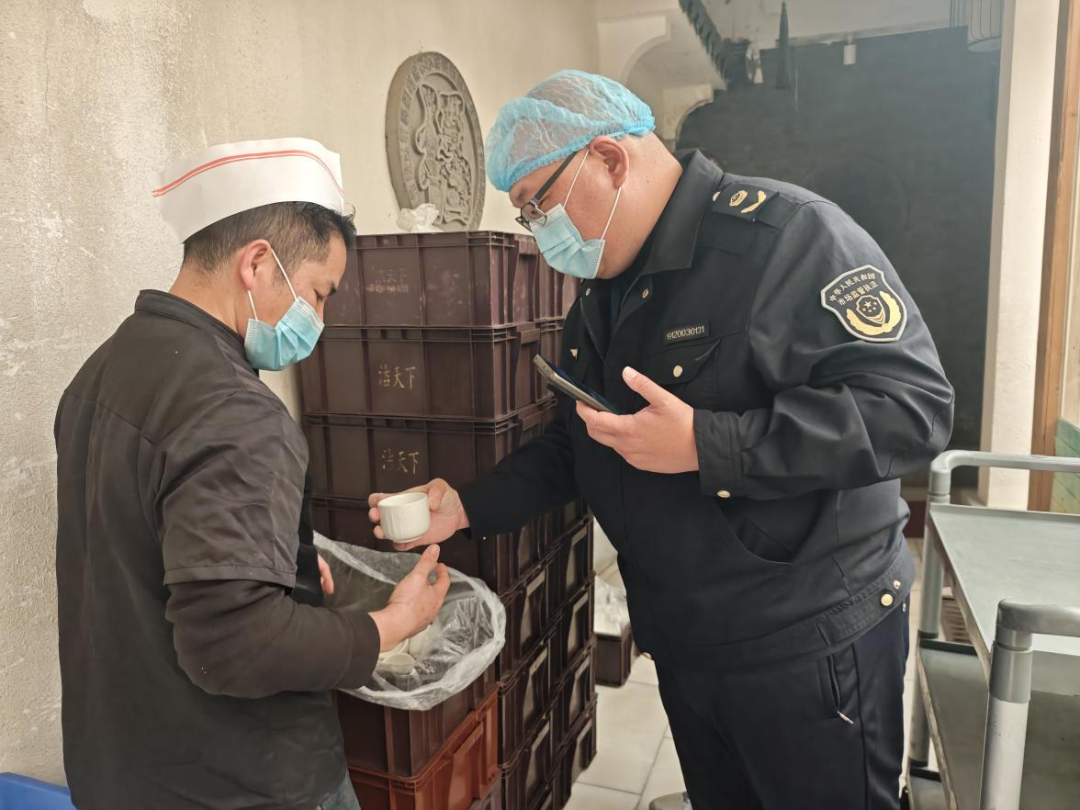 ▲执法人员对餐饮单位购进使用的集中消毒餐饮具开展监督检查