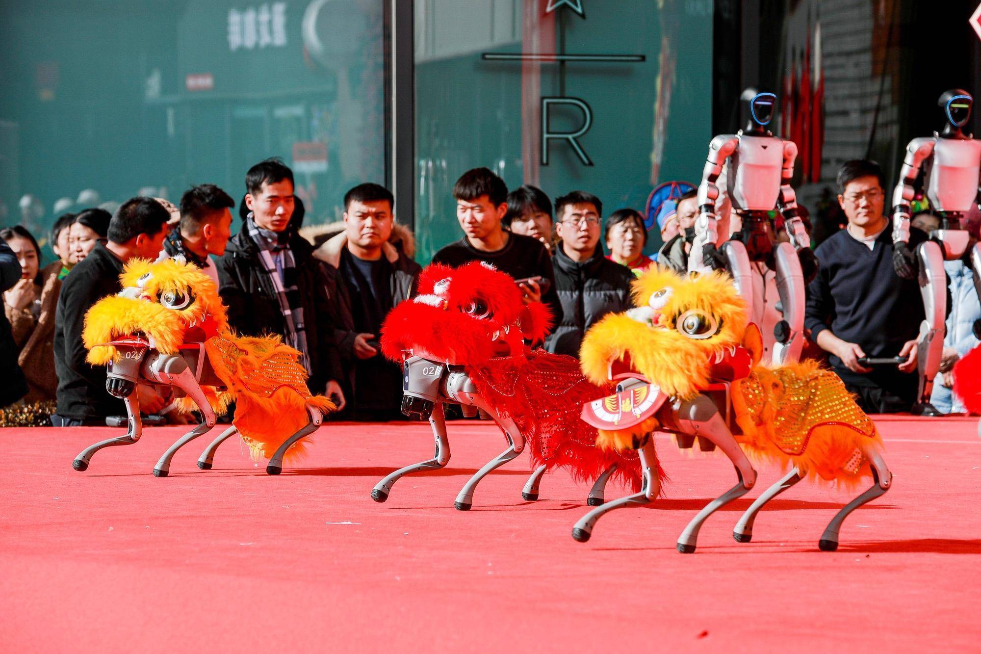 活动现场,传统与未来感交织。在创意秀《非你不AI》中,智能机器人化身“非遗传承官”,精准的机械律动与传统舞狮的灵动招式同台碰撞,引得观众惊叹。更具视觉冲击力的是踩街巡游队伍:威风凛凛的机甲悟空披挂红绸,与色彩鲜艳的舞龙、高跷、秧歌方阵并肩前行,形成一道移动的“科幻民俗”风景线。据了解,今年的巡游路线将首次拓展至中关村AI北纬社区和北京中关村学院,让锣鼓声与年味儿直接涌入了科创园区与校园。