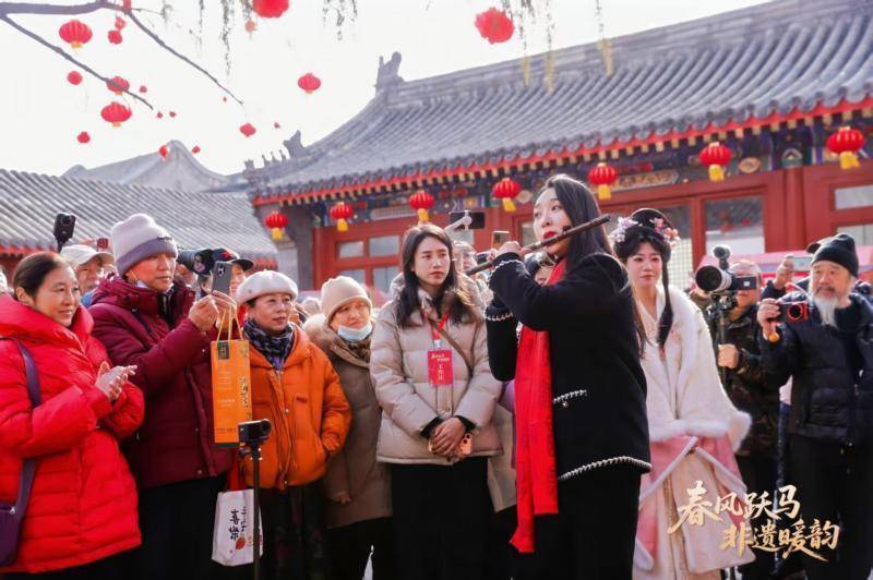 在琉璃厂火神庙内,孙楚泊以竹笛接连带来《扬鞭催马运粮忙》《赛马》《骏马奔驰保边疆》等经典曲目。选曲紧扣马年新春主题,将传统民乐的雅致与民俗节庆的热烈完美融合,古老笛箫声在百年文物建筑中流转回荡,既让观众感受非遗与民乐的独特魅力,也为小年氛围注入灵动鲜活的艺术气息。