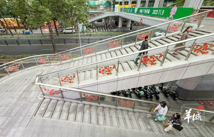 当市民游客行走于江南大道、工业大道、东晓南路、昌岗路、新滘路等道路上时,会惊喜发现人行道铺装已替换为更加美观耐用的花岗岩人行道砖,行车于此则可以感受到车行道罩面、破损路面高品质修复后所带来的畅顺感。享有“花城”雅称的广州,总能以“花”为媒传递城市浪漫。漫步海珠区的道路,随处可见花朵绽放,无需刻意寻觅,便能与这份秋日烂漫不期而遇。位于江南大道华海大厦的人行天桥,因品质提升而有了全新的外立面,玻璃护栏上绘有广州市花木棉的精美图案。在东晓南立交桥,驾车畅行的市民,还可在立交桥的两旁,欣赏到簕杜鹃花海。