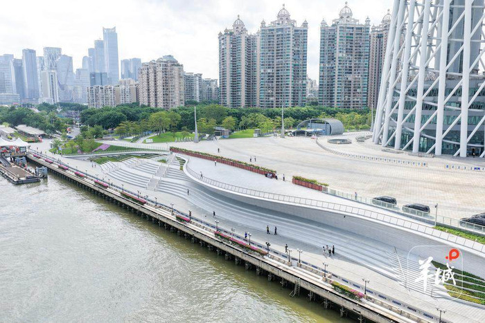 想欣赏现代化的珠江美景?首选驻足广州塔。9月29日,广州塔旅游景区“上新”滨水大台阶。该台阶以“缤纷粤秀台”为设计理念,自广州塔二层平台向下方江岸延伸出一座涟漪曲线形态的看台。游客至此不但可以倚靠江边护栏感受徐徐江风,也可以在台阶眺望江对岸。